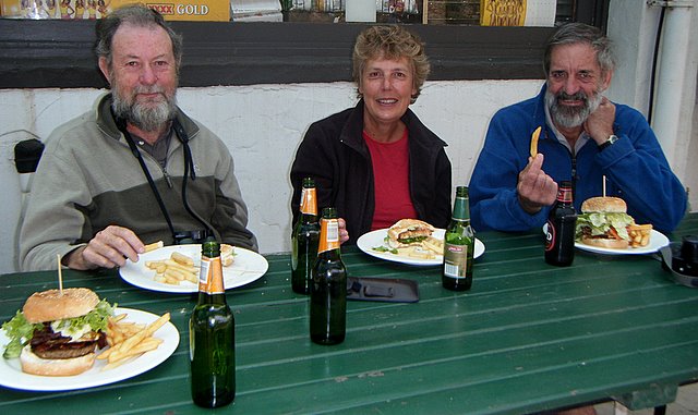 A sleep in and breakfast with R and K before a quick walk down into the Glen itself for some birding. A large pool of water is walled off to the south by a brilliant orange cliff which is floodlit at night for the special effect. We had lunch at the bar overlooking the cliff while hordes of day visitors pass through. Alison made friends with a black dog travelling with his family in a combie. An early dinner of fish in a gluggy orange sauce and canned mango pavlova before Chris Aronston, the folk singer appeared. He started his repertoire from the beginning again so Alison retired while Digby stayed, even buying his cd.