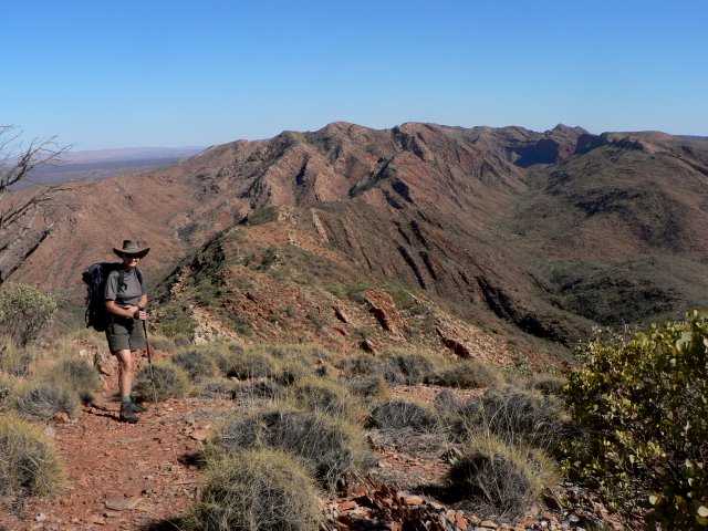 On the trail and walking by 9 am. A group of women with day packs overtook us, heading for Simpson Gap, that’s tomorrow for us with the full packs. Our highlight for the day is the walk along Euro ridge, with clear views right across to Alice Springs from the razorback.