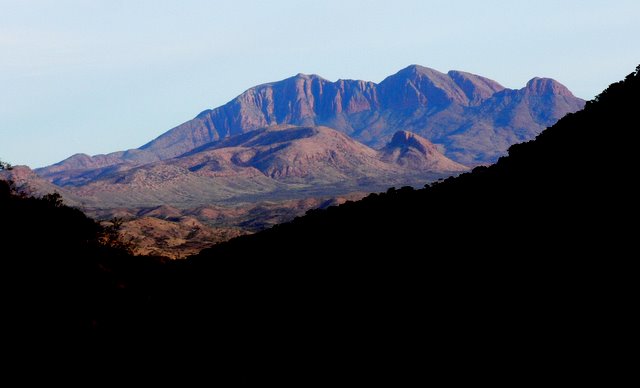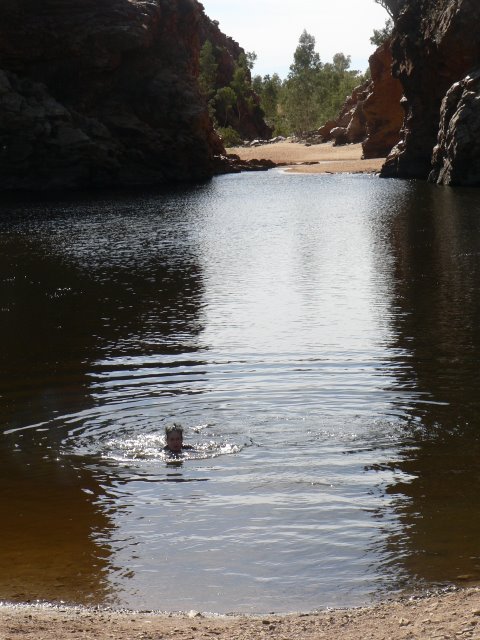 Jay Creek has a shelter similar to the ones along the Bibbulman track. Built in steel and designed to withstand high winds, but cold and exposed inside. We set up our packs as a windbreak. We spent the afternoon nearby at Fish hole, paddling and bird watching. Alison had three Jacky Lizards leaping off her arms and legs to catch the ever-present flies. Camel trains once used this pass coming from Hermansberg to Hamilton Downs station. There are still cattle loose by the trail and some areas, especially Spring Gap, are severely damaged by them.