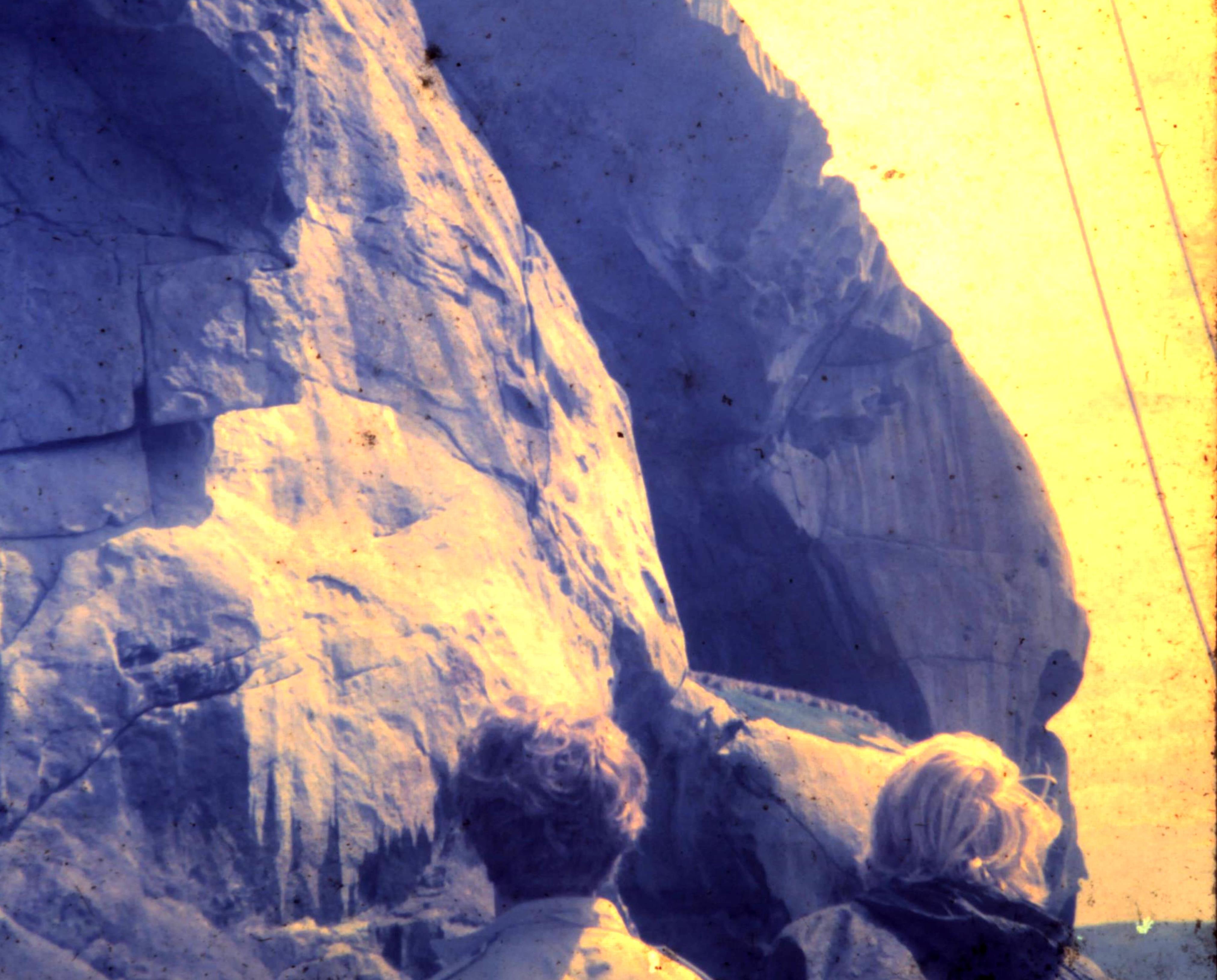 The chimney around the corner became our target, but reaching it posed quite a problem. Digby found that he couldn’t traverse around the corner at the point where the slope was least, and his only chance seemed to lie in an undercut fold lower down. The fold was about three metres long and too wide for fist jams but too narrow for both feet and hands, but apart from the fold the rock was smooth and vertical. When Digby declared that there were no handhold inside the fold, John and I thought that was the end of it, but Digby thrust his knees and elbows into the cleft and with both feet hanging out into space proceeded to do a knee and elbow traverse. I looked at John and John looked at me, then we both looked at Digby disappearing around the corner with blood streaming from his knees and elbows as the granite cut into his skin. “He’s keen”. “Yes, he’s keen”. When Digby called “on belay”. I looked at John, and John looked at me. “I’ve got a crook leg”, I said for openers. “I haven’t been climbing all year, and besides you’re the bloody climbing leader”, said he. This comradely discourse was terminated by Digby, who yelled out saying he’d pull me across if necessary. Keen bastard, I thought. I decided to relieve myself of all unnecessary burdens, and went over to the edge of the rock and lowered my pants accordingly.