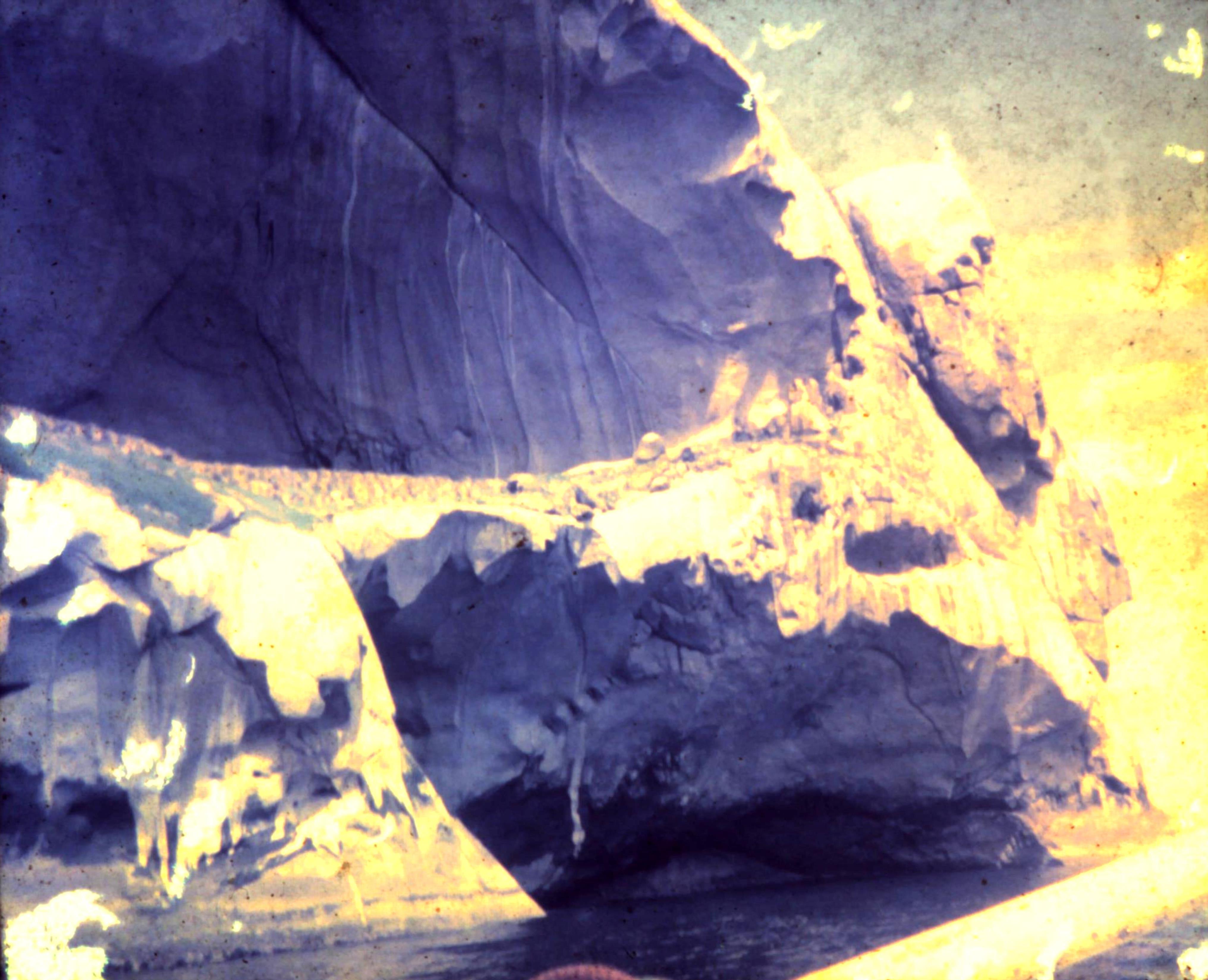 There was a sea cave below the Olympus and in it a barnacle encrusted incline seemed to offer itself as a suitable landing site and launching point for a direct assault from below. A landing was duly executed and all the expeditions’ supplies were landed whilst walkie-talkie contact was maintained with the mother ship. During this manoeuvre the rubber dinghy was holed on the barnacles, much to the delight of an itinerant seal which frolicked about enjoying the confusion. Fifty metres above us the floor of the cave waited, inviolate.