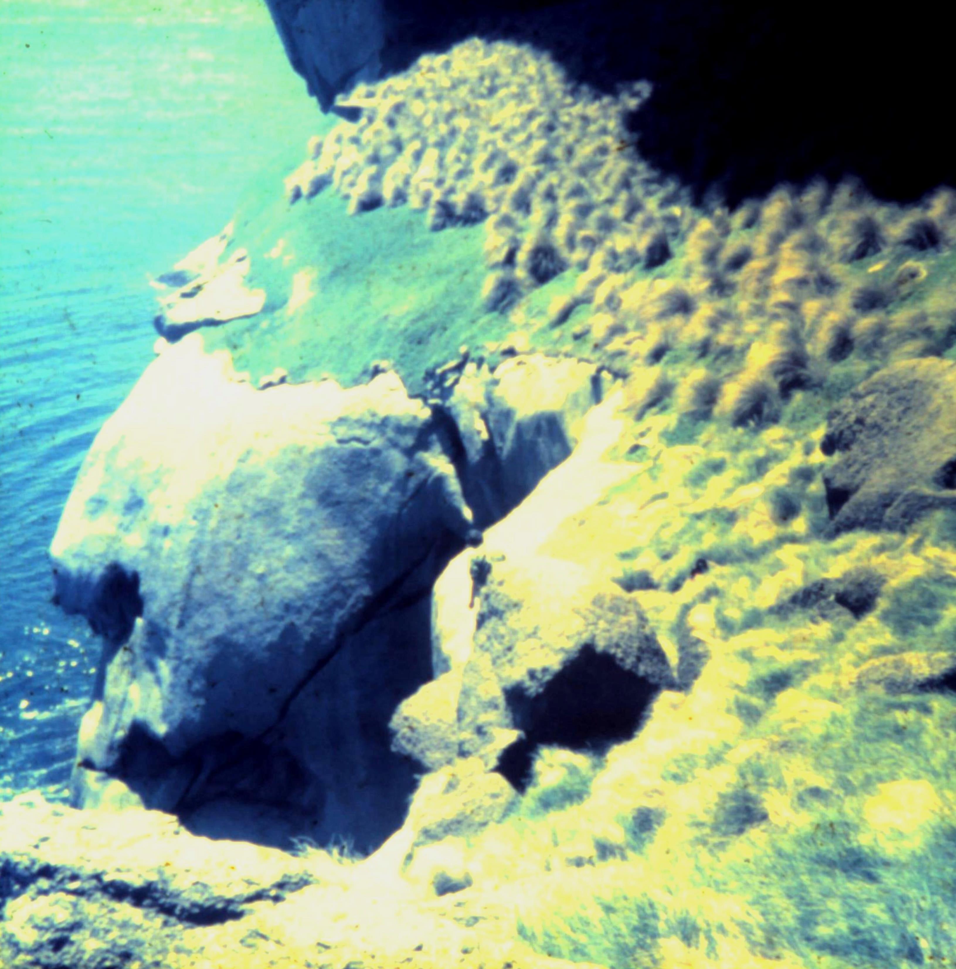 The contents of the cave then, do not form the hoped for reference point for the changes in vegetation types else-where in Bass Strait. Plant growth is extremely restricted and the small mammal fauna characteristic of the other islands of Bass Strait is apparently absent. However this brief survey suggests that the cave warrants further investigation as regards the contents of the salt mounds and shearwater burrows.