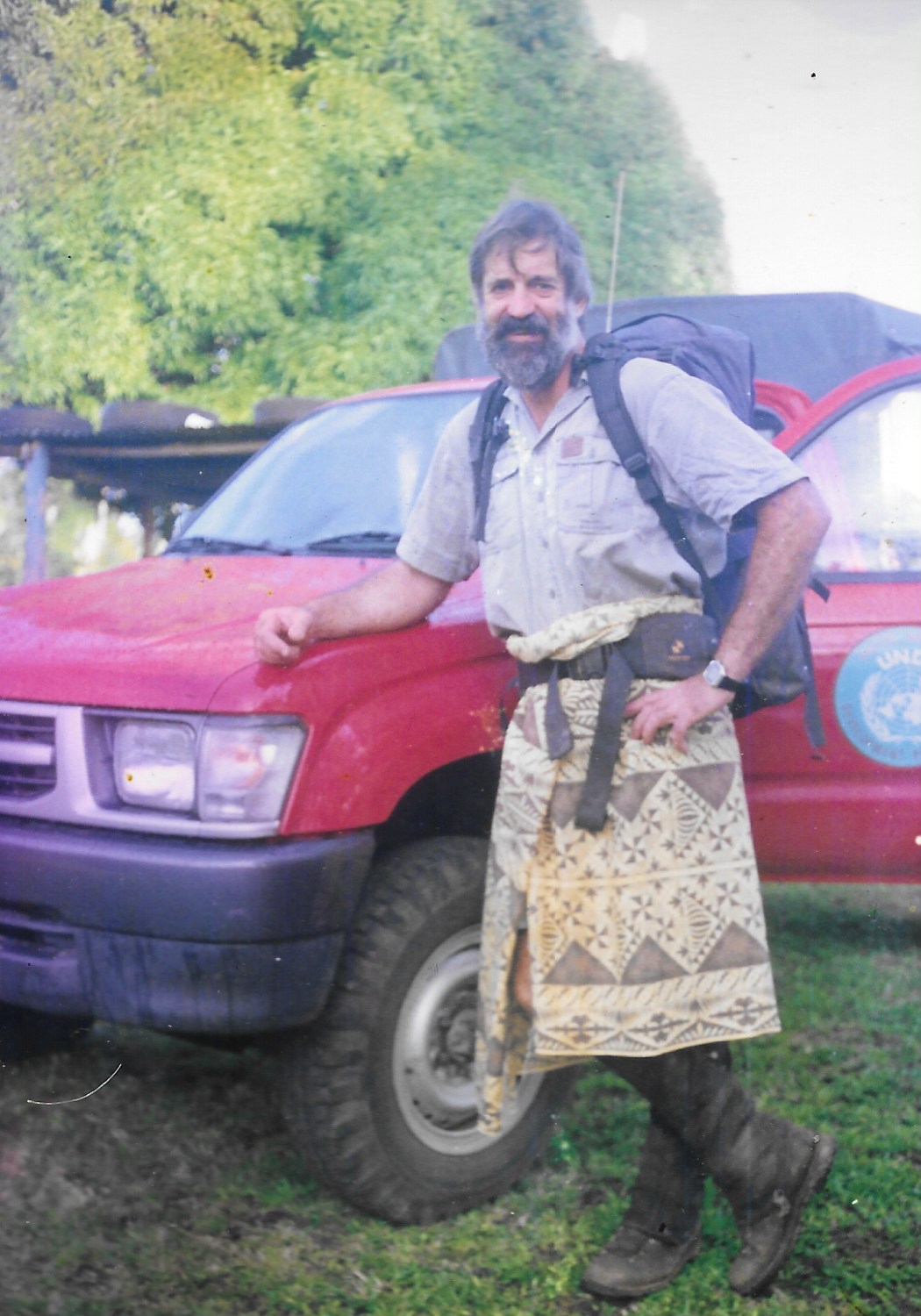 We started out driving up the track by 7:30, climbing in 3 miles to about 2000 feet where we were blocked by a fallen tree. Packs on and wade off through waist high wet grass. Followed a jeep track for the first km or so until Mose finally turned up a steep embankment and into a banana plantation.Banana clumps to no pattern with occasional damaged rain forest trees. Mostly regrowth softwoods. This continued for two km or so with a steady uphill grade. Mose doing a bit of cutting here and there of intruding ferns and vines, but mostly just wading through the high grass as if it was knee deep snow. Worse than snow in many ways as the ground itself was invisible and rough with holes, boulders, rocks and fallen trees, all concealed. Paul and I stumbled on through most of this section. The bananas gave way to kava bushes as we climbed, with Mose identifying them to be his plants being cultivated for sale. He would often pause as we went past a good kava plant to cut away some of the vine overgrowth. This together with his track clearing and cutting produced a stately pace that we could just maintain.
