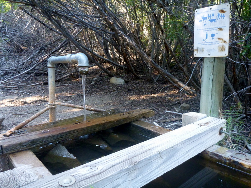 A brisk night with a steady wind had us snuggled down shortly after sunset, 8:30. Getting up for a pee is becoming less common, partly due to the cool nights and partly the dehydration. We’re both suffering pack soreness, but legs and feet seem fine. My nose and throat are having problems with the dry air, and I have had to keep sucking water to soothe the throat. We’re off walking again by 7:30am for a couple of hours in shade on a fairly level trail before dropping to the Chimney Creek campground and lunch by flowing water. The campsite was burnt out in June but the PCT was not damaged. We start climbing again after lunch following a valley before turning into a gorge in a metamorphic zone with a creek far below. Our camp is a barrel spring forming the source of this creek at an abandoned Barites mine. We find Todd there resting, having waited 11/2 hours for us to catch up before he headed on for another 10 mi. We manage our first billy bath and hair wash in bitingly cold water from the spring. More mule deer, one a 10 point in velvet, and a weasel today.