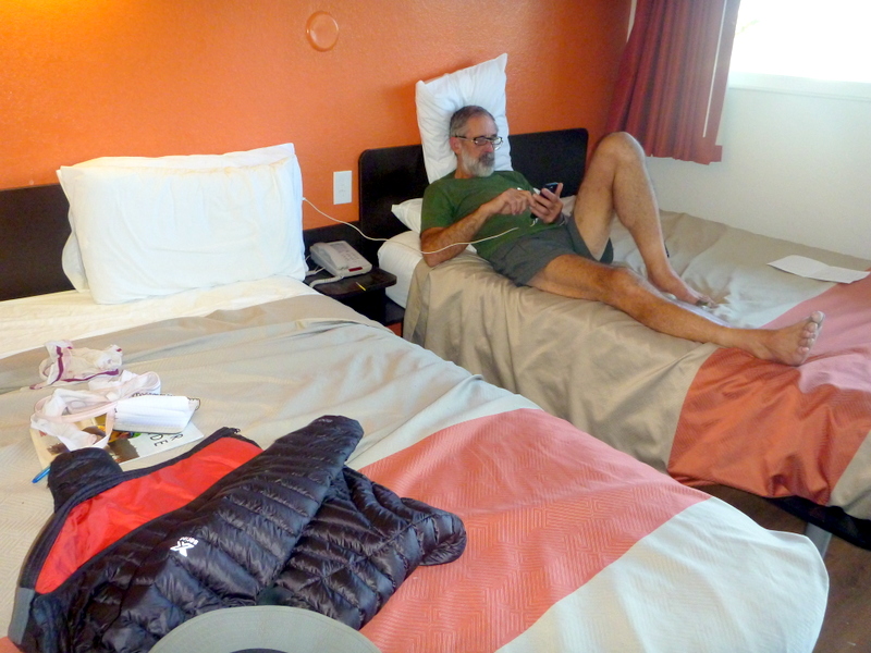 Wed 13 July. We managed to walk around 7mi around the town to obtain a sim card, our groceries for 4 days walking and a few odds and ends. Finding the gas bottles was a problem but eventually found a sports store with the right type in stock. Couldn’t find an adaptor for my camera charger, but the usb chargers for Ali’s phone and camera were common. Trail magic started working as we arrived back at the motel to find a mobile electrician parked next to our unit. He obligingly fitted a usa type plug to my charger cord, problem solved. Charged us $5 but paid him $20. However no trail angels responded to our need for a lift out to Walker Pass, so Ali arranged for a taxi to collect us at 8 tomorrow for $175. That way at least we can start walking on Thursday and not have to wait another couple of days for bus connections.