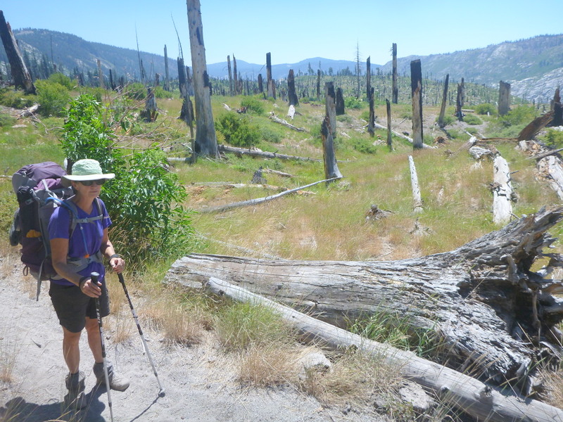 This was a very long day but after the short climb out of Purple Lake it was all downhill. The last 7 mi was initially through a wasteland of sandy trails and dying trees then a burn zone which had had very little tree regrowth even after 15 years.