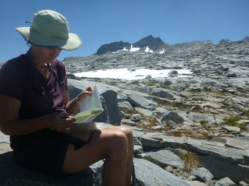 There was nothing moving in the meadow this morning with it being so cold, although there was no actual frost on the ground. We were off and climbing again by 7:15, eventually making it to 11,800 feet, well above the tree line with rock and peaks in all directions. We stopped at a creek crossing for lunch and met Amanda Gehrig, our first ranger, checking bear boxes and clearing out abandoned rubbish and food. She invited us to help ourselves from the leftovers, so a windfall of several bars and bags of nuts were very timely, as we’re just beginning to wonder if we have enough food to get to Muir Trail Ranch as scheduled. The campsite was sheltered in a boulder cluster, with a flowing stream nearby, but still another 1400 feet to climb to the top. I’m getting a bit of vertigo from the low blood pressure but we seem to be moving well if slowly. We had around 100 people go past us southbound on the John Muir Trail (JMT).