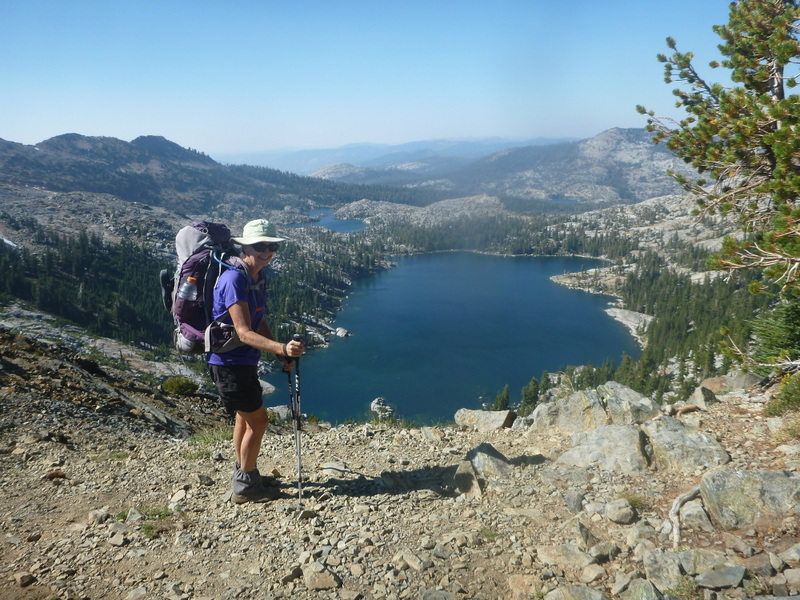 School goes back from summer break tomorrow, so there are people coming at us all morning on this heavily used trail. We pass at least 50 people by the time we reach Aloha Lake, more rock than lake, then we seem to leave the crowds behind as we head down to Heather Lake for lunch and meet Henry, a Golden Retriever who was determined to share our lunch as well as get some of those pesky ducks. He did sit for his biscuit, but then dived into the lake to emerge and shake all over us. Somewhat soggy we head on down to Louisa Lake, before starting the climb for the afternoon up to Dicks Pass only to discover that we have to climb another 200 feet to reach a ridge where we can begin the descent around cliffs. Down 500 feet to the lake and a secluded campsite in the trees set back from the lake, we’re finding it better to be a bit further away from the water and the other campers.