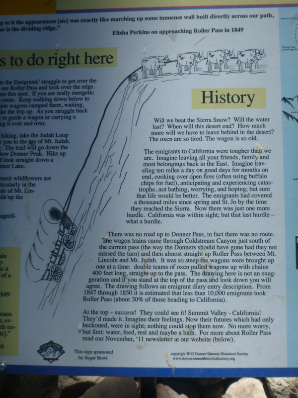 More and more day hikers come by, including some trail runners and a school group. We boggle at Roller Pass, where wagons were dragged up a near vertical slope by oxen. 30%of immigrants came this way. Their story is put into the background as we learn the story of the Donner party, who got lost in winter in these mountains.