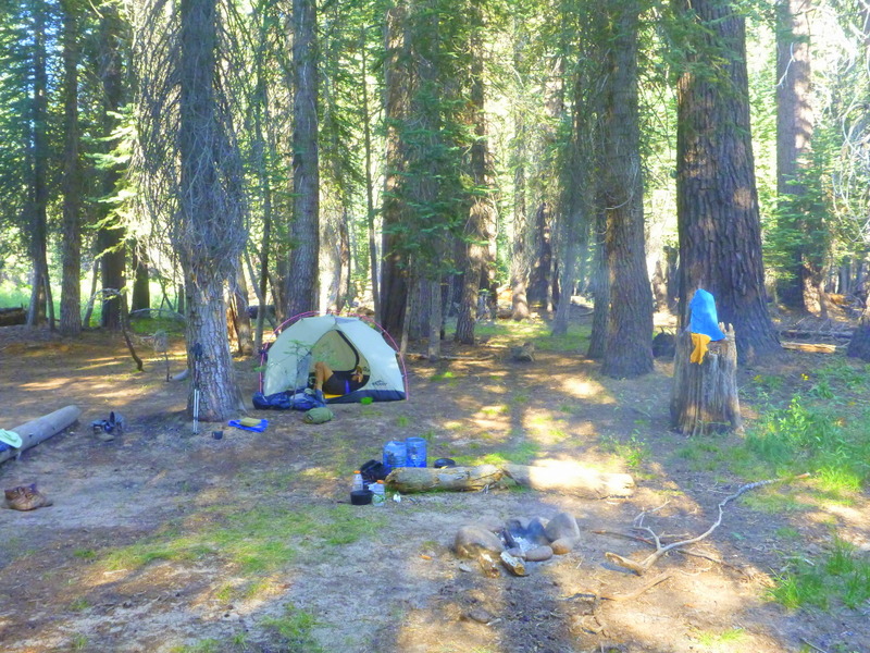 Eggs and bread for breakfast after a mild night in the forest but it’s good to get away from all the people and cars, even the JMT hikers head southwest to Yosemite leaving the PCT for us again. Heading out by 8 past Lembert’s Dome and passing several other smaller domes while following the Tuolumne river as it cascades down to the Glen Aulin Campground. This proved to be a walk in camp with minimal facilities and no food on sale so we continue without the hoped for burgers. Some passing hikers told us that water was available further on at a meadow, freeing us from the need to carry enough for the night. A couple of hours climbing brings us to an open meadow and flowing water so we look around for a campsite, finding one of the best we’ve so far used for the trip. A terrace overlooking the meadow but set back in the forest with a fire ring and lawn for the tent. A billy bath by the stream after a hot days walking and then able to sit around a fire had us rapidly relax back into contentment. We were watching the peace on the meadow when a beautiful silver grey coyote emerged from a gully and charged to take a ground squirrel. Shook it a few times, then trotted back into cover. Just like watching a wildlife doco.