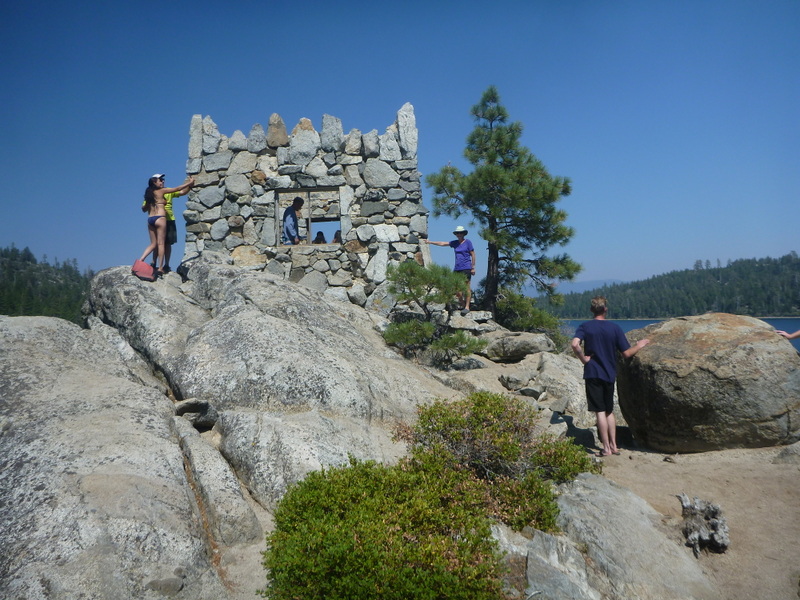 We called Jeff Kidd, whom we had met several weeks ago on the trail, who offered to collect us and take us out for the day with friends on his boat on the Lake. He drove us about 10 miles around the lake into Nevada to where his home made pontoon barge was moored. Four friends of his joined us, Stacey, Robin, Matt and Celeste, with dog, and we headed out across the lake on his part house boat, part trampoline!, to an inlet with a heritage house and a now abandoned Tea Room ruin on an offshore island.