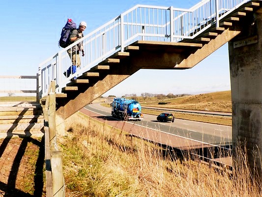 We’re able to walk in shirtsleeves today with a windless and sunny sky. It is easy strolling down through Shap before the track strikes off through fields to a footbridge stuck out by itself, allowing us to cross the M6 and its 8 lanes of traffic to and from Scotland.