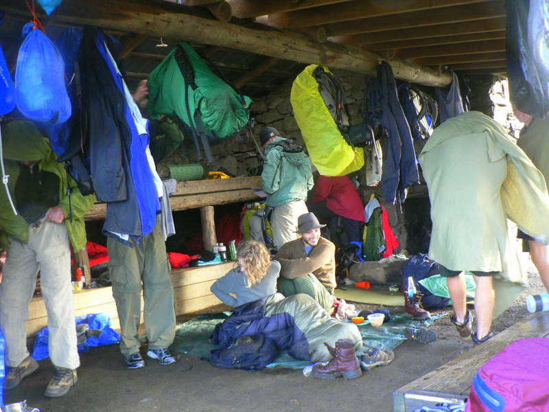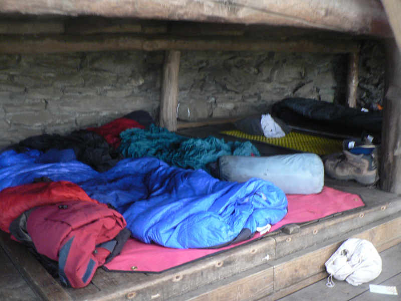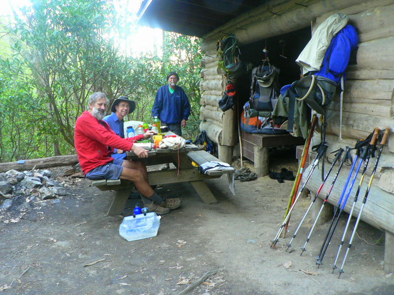 A typical shelter has three sides and an overhanging roof, with a picnic table under the overhang. This makes it possible to cook on the table under cover, while keeping food away from the sleeping area. This is important not just for the rats and mice that infest such places, but also to keep bears from being attracted into the shelter. After dinner, all food must be bagged and slung high up and away from the trunk of a tree every night for the same reason and there are many stories circulating about bear interactions. Several shelters have poles or cables to assist in getting food up and away. A problem bear might be trapped and relocated, but if it persists with bad behaviour, it will be shot and killed by rangers.