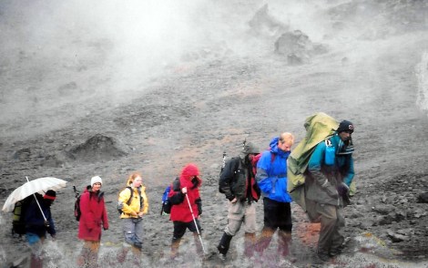 It’s 550m climbing and 400m descending today, so little gain in altitude for a hard days work. The landscape is scattered volcanic boulders and we are walking across what was the bed of a glacier only 8 years ago. There are numerous barren rock ridges to scramble over but we finally reach the high point as clouds and mist roll in and lunch is served. A pastry stuffed with veges which we eat huddled into our rain-jackets hoping to stay warm enough for the afternoon as we are still wearing shorts and t shirts. The crowds continue past as we eat, with 221 people going past us at some stage during the morning and still more still visible on the ridge below.