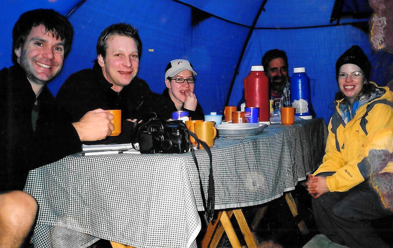 We descend with Godfrey, running and glissading in the deep snow, taking two hours for the descent to camp to find the porters huddled under a rock overhang and the cook tent collapsed . The cooking gear has all been moved into the mess-tent, but the cook is deeply apologetic for being unable to give us a cup of tea, as it is too cold for the gas stove to light. The porters are underdressed, so we give away a couple of woollen jackets and move into sleeping bags to wait for the return of the summit team. A cup of tea arrives at 9:30 and the others return at 11:30, so we manage a couple of hours catch-up sleep.