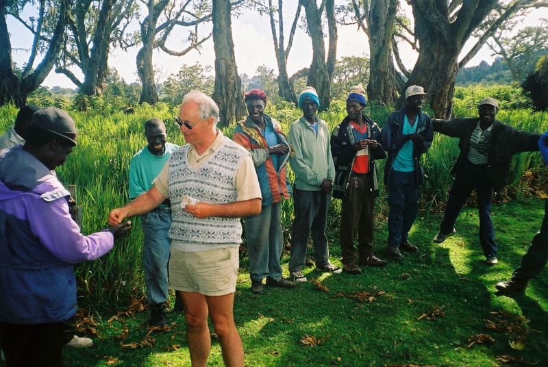 It’s only about an hour down to the park gate where a land rover is waiting. In a formal presentation, with everyone lined up we pay out our tips, with US$27 to each porter, $52 to Sami and Patrick. Iain also gives everyone a coin from the Kenyan money of 50 years ago as a momento.