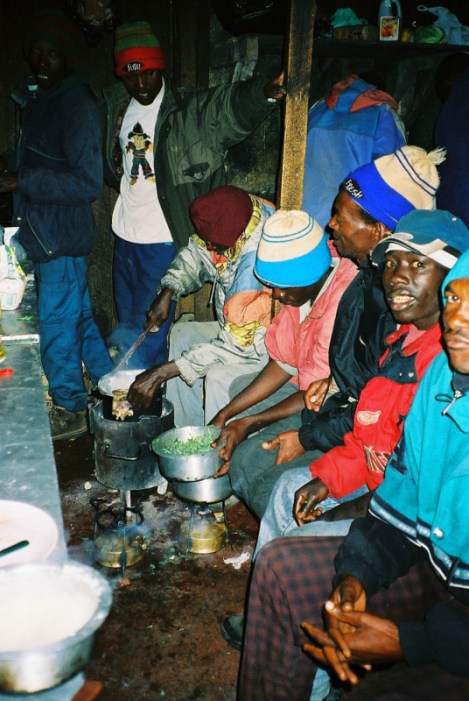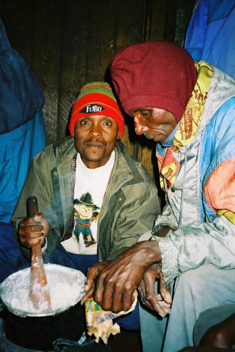 We wash our hair in the creek near the hut which is so cold it is painful on the scalp. Our cooks serve up another splendid 3 course meal with soup, chicken and veges and a dessert. After dinner we are allowed into the kitchen to watch the porters make their own dinner from maize meal, ugali. They give us a taste, but it’s more like clag than anything else. You’d have to grow up with it to like it. The 4 of us are sharing a dorm room for 16 and sleep really well despite the altitude. It’s so cold that our breath comes out as a cloud.