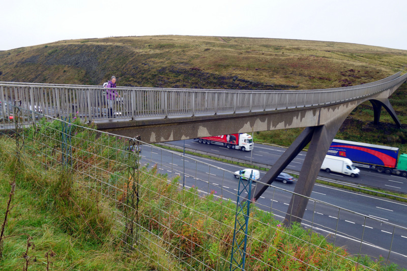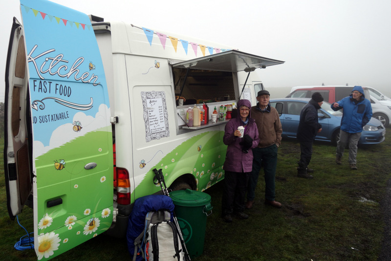 The climb for this morning is up and over Black Hill, no longer black thanks to a massive regeneration and recovery program. Tonne bags of lime fertiliser are scattered over the plateau and sheep have been fenced out. The track follows a sharp edge, and we were grateful for the wind blowing us away from it as it’s a long way down. From near the top of Black Hill, we can see our lunch target, another major road across the moor where we have been assured that as it is a Sunday, there will be a hot food van parked in a layby. As we get closer, the tension rises as although we can see the food van, there is no movement and the sidewalls are shut. We’ve resigned ourselves to biscuits and cheese when we realise that the van is operating out the backdoor because of the wind. Several cups of tea with egg and bacon butties later, while we huddle up against a stone wall out of the wind, and we are revitalised for the afternoon.