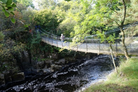 A 150 year old suspension bridge crossed the river to some recommended tea rooms for a good coffee and poor cakes for morning tea. Lots of info and signs and a bird feeder strategically placed outside a window, with about a dozen species haggling over the food. We learned that the word force for waterfall came from the Nordic term of Foss.