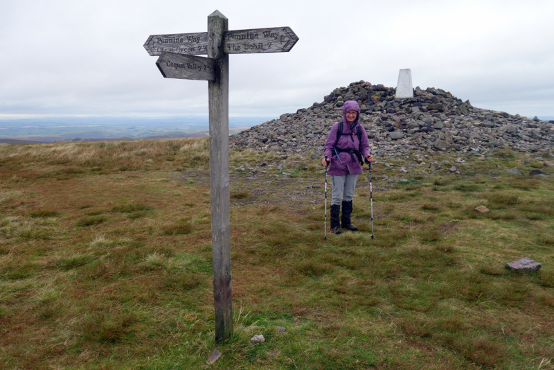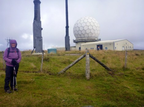 All went to plan and we’re slipping and sliding up cow shit covered lanes out of Dufton by 8am. It was a steady uphill grind for a few kms before a small bridge and the main climb started. This was steep with steps, then a plateau before steep again for about 6 steep bits before topping out on Knock Fell at 670m. The Way then bobs along, with 200m down and 200m up to Dun Fell and it’s radar station, then repeat for Little Dun Fell before the final climb up onto Cross Fell at 900m, our highest point for the walk.