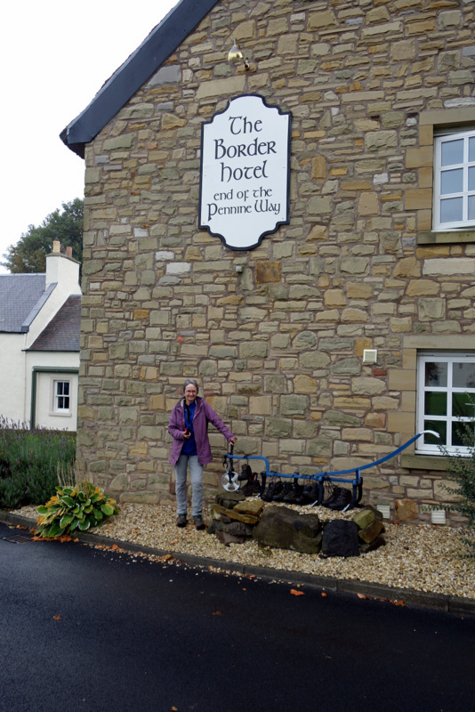 Our last day on the trail and we started walking from Trow’s Farm at 9:30 with the climb back to Windy Gyle looming over us. It only took an hour to get back to the Way, then slabs and bogs in equal measure up onto West Cheviot. A detour out to the main peak didn’t attract us, so we continued onto a bothy for lunch. Two of these have been placed in extremely exposed positions as shelter huts. I guess that makes them easy to find and they would be kept free of snow by the wind. Room inside for 6 with 3 on benches and 3 on the floor. More than that and life would get warmer inside at least. We climbed on over The Shill, then started the 8 km descent to Kirk Yetholm. As it was a Sunday, there were people everywhere, dog walkers, fell runners, day hikers and a few like us just trying to finish. There was a high path for people happy to follow the lay of the land and a low path for those like us who just wanted to get down. The low path gently descends on farm tracks, then a road until it rejoins the high path at a car park. Then there is a last ridge to cross on 2 km of sealed road. Just as we started this bit, Ali stuck out her thumb and a lovely couple picked us up and took us to the front door of our B&B. That made for a great finish after a strenuous and foot pounding day. Claire at Mill House took us in, got our washing done and booked us for dinner at the Border Hotel where we can get our free pint and certificates signed.