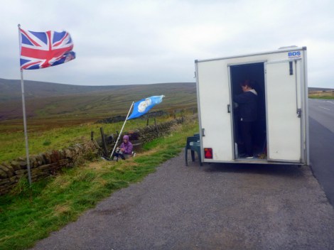 Sunday greeted us with miserable weather, drizzling rain again with that biting wind. There was a 400m climb for the morning, but it was all on rough tracks so route finding in the cloud wasn’t a problem. As we got closer to the top, it became apparent that there was a serious mountain bike competition using our path. Bikes whizzed past in both directions, appearing out of the cloud with little to no warning, so we had to stay on full alert. We started across the summit plateau to find a motocross competition in full swing around us as well. This was at the end of a sealed road, so there were several hundred people with cars and trailers parked in all directions. We were boggling at all this activity, when two of the organisers pointed the hot food van out to us. Hamburgers and hot chocolate with marshmellow for lunch on the summit were a wonderful compensation for our invaded feeling. Motocross bikes and mountain bikes continued past us, very politely, for another kilometre until we turned off their path at Ten End and started down towards Hawes and Laburnum House.