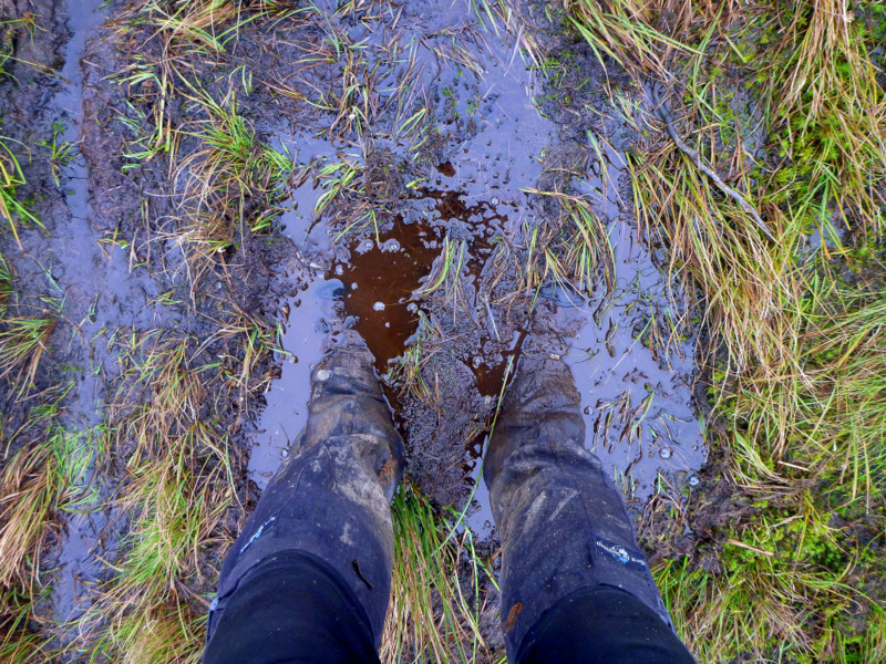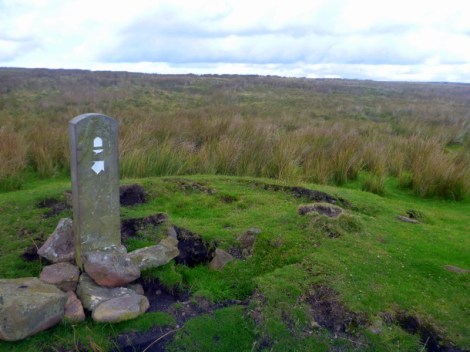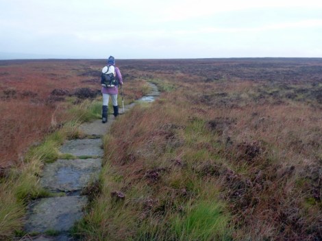 The through hike is regarded as difficult, although the walking itself is relatively easy with few steep sections and is well marked. The difficulties arise from the state of the track and the English weather. The track runs for many kilometres through wet peatbog, and has been much damaged and widened by generations of walkers and sheep, all trying to dodge the mud. Some of the worst sections have been paved with recycled stone slabs, but while these contribute to impact bruising, at least you can stay clean. I saw no evidence of attempts to divert water off the track, either with lateral or cutoff drains, instead the mud is accepted as a way of life. A walker does get very adept at picking the difference between a knee deep bog, firm dry bog and sheep shit mud slurry on a firm base that forms everywhere else. Waterproof boots and knee high gaiters are essential, but unlikely to keep your feet dry.