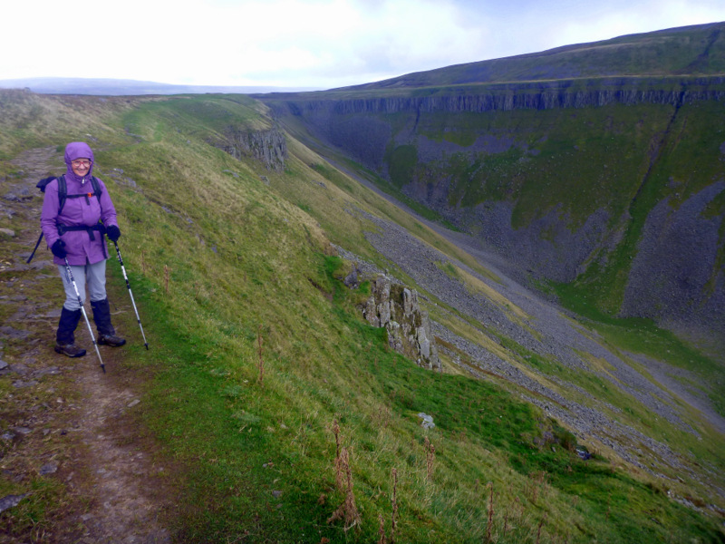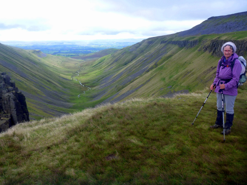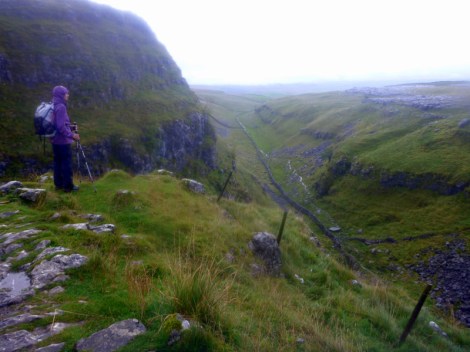 Gunfire was by then echoing around the valley, hopefully from gun butts a kilometre or so off to one side, while appropriately there are more warning signs of unexploded ordinance in the moors around us. We keep moving and appear to get out of range of threats as we approach High Cup Nick, a spectacular glacial land form with a semicircle of cliffs around a closed valley.