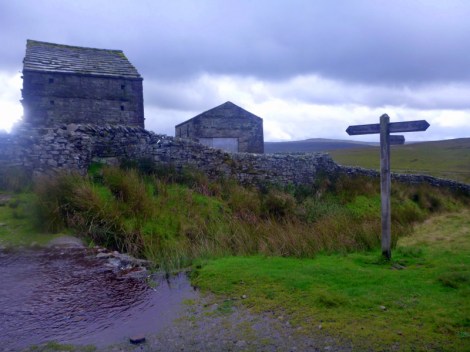 The burst of foul weather was expected to continue for a few days, so with a major climb over Great Shunner Fell looming, we didn’t hesitate to book a taxi to skip 10 km and stay low down for the day. The taxi driver said he could fit us in at 7:30 if we didn’t mind having his dogs in the car with us. He was booked to help beat for grouse, and would be going straight on after dropping us. Our host was happy to feed us at 7, as she also had a group of farmers coming in for an early breakfast and it would help her to get rid of us as early as possible. So trail magic took control and had us out and on the Way early next morning, with 6 hours shaved off our timing for the day. A missed signpost had us following the wrong path out of Thwaite, but after a few hundred m, a check on the gps let us know we were several hundred m away from the true path, so back we go.