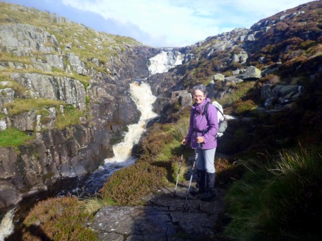 A flock of pheasants were running around in the paddock below us, but they disappeared as the pub started to wake up. They had apparently heard about the shooting party which had started to assemble at the pub as we left. We were back on the Way after about 30 minutes, again following up the river to where it emerged from a dam. This gave us an exposed and frightening climb up wet and slippery rock alongside Cauldron Snout before reaching the dam wall and a farm track again.