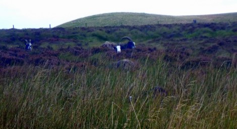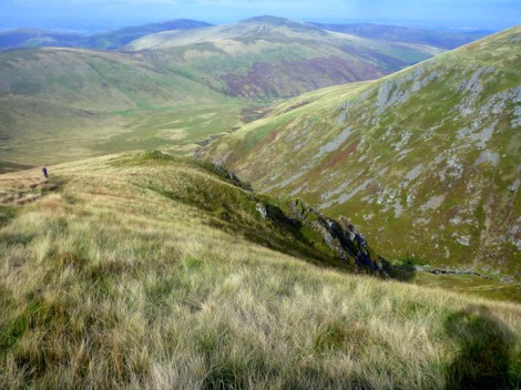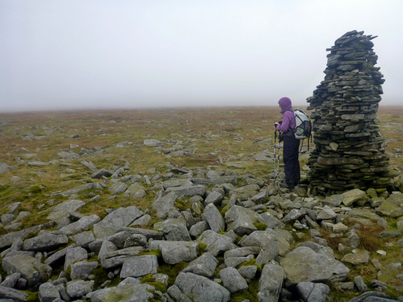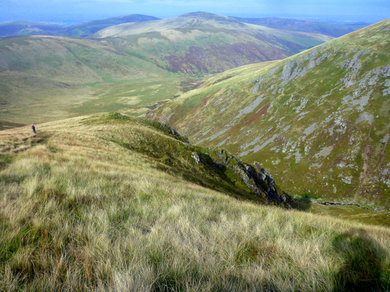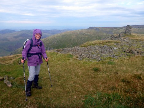Fishermen in boats were sitting out there, huddled against the wind and drizzle, but determined to bring home their catch. We continued on past a hotel, now a recreation and field studies centre, lots of sheep on several active farms and after about 4 hours steady climbing we reached the double cairn marking the top of Fountain Fell. Mineshafts were scattered about, some with fences and some with dire warning signs. We don’t leave the path. The afternoon light makes the next range across glow as if the grass is backlit, but that’s our next target and we wonder how on earth we can get up there as it all looks impossibly steep.