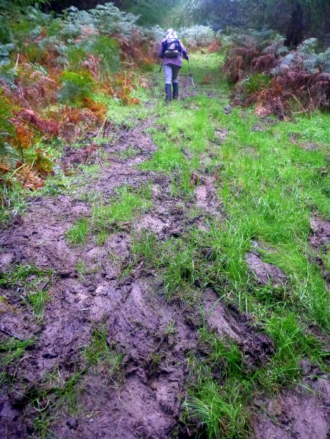 Our host had also warned us about a badly bogged and broken 4 km of the trail for the day, and gave us a suggested route around the bog on a forestry road, so with some misgivings we took his advice, deciding that 5km of road had to be better than 4 km of bog. The walking was boring along the roads with little to see for the 5 km and about 300m of climbing through pine forest. Patrick from our B&B caught up to us shortly after lunch, where we regained the Way, and told us that the boggy bits were nothing worse than where we had walked already. He walked with us all the way down the next 8 km to Byrness, chatting about his job in Belgium all the way and the kms just disappeared with the company. Two large hunting type dogs ran past as we headed down, they knew where they were going and just charged past, so we hoped that they were not feral.