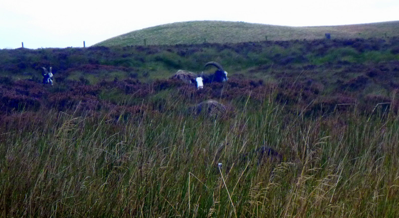 There were still lots of sheep everywhere on the bare moorland, but a few individual black ones caught my eye, then a flock of 20 or more. We finally passed close enough to one of these flocks, to realise that they were the famed feral mountain goats of the Border Ranges. They were apparently released in 1830 after the closure of a monastery, now feral and numbering about 400 but left to roam at will. They were 50% bigger than the ubiquitous black faced sheep, with huge curling horns adorning the head. They were not fussed by our approach to 20m with the billy watching but the others ignoring us, so not feral goats as we know them.