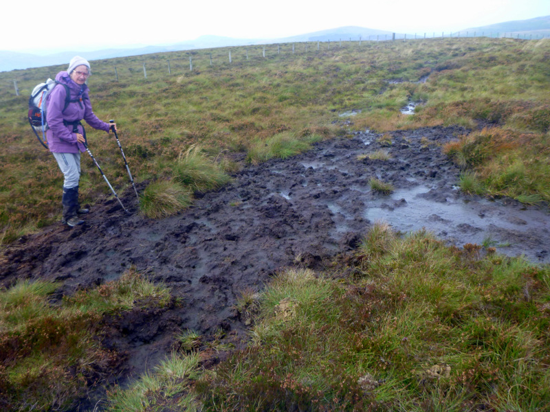 The trail next day climbed out of the valley on the steepest and slipperiest path we’d yet encountered for the first couple of hundred m out of Byrness. This was really exhausting work and made us reflect on the overall lack of maintenance we had seen and the amount of repair work needed to keep it as an iconic trail, particularly after seeing all the volunteer work put into the Appalachian and Pacific Crest trails. However we made it up to the ridge crest and the Way continued climbing more gently along the border fence from there. We had started in mist and drizzle, but as we climbed the cloud lifted with us, so by the time we were at 500m, we had a clear blue sky. The wind was still very cold, so parkas remained on, with beanies most of the time protecting the ears.