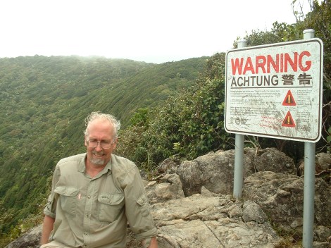 From the north peak, the main summit boulder looms well overhead and because of the cloud movement appears to be falling as you watch. The view to the north is of the green sea of trackless rainforest that we had just come through.