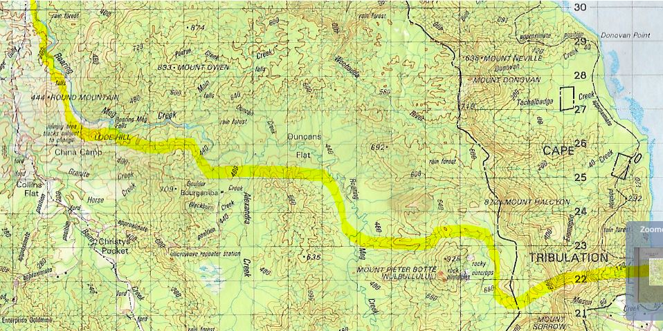 I recently realised that this 3-4 day walk is one which deserves to be recorded although it is definitely one for the hyper fit and competent navigators among you. Alison and I walked this in the mid 90’s in training for an extended walk in SW Tasmania, and I went again later as a guide for a police search party. It is mostly through untracked wet tropical rainforest, and includes three rock ascents with significant exposure. Several people have become lost in the hills west of Cape Tribulation, one permanently, so ensure that you have backup, even if it is simply a PLB.
