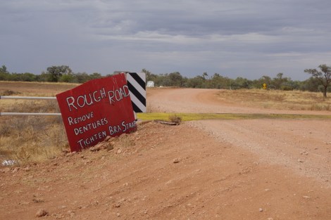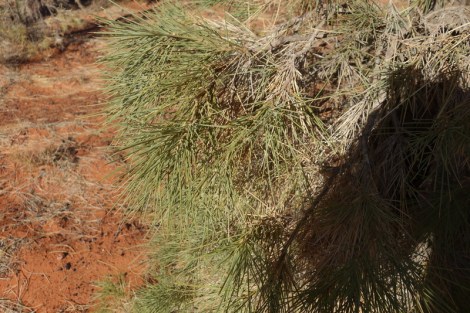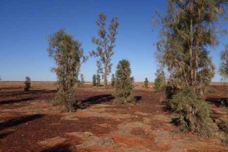 The track was gravelled and graded, so we were able to sit on 60kph, carefully, but the road again bore little relation to the map, so we often had to abandon the good road in favour of a faint track. We still managed to turn up at the front gate of the Acacia peuce reserve, set aside by the local grazier, Mac Clarke, when he realised that they were disappearing and that they grew no-where else. The leaves of this acacia resemble pine needles, making it very distinctive but much sought after for the timber which is very durable. Our track was marked as going through the reserve, which it may have done once, but it now follows the fence line around the side. It was quite disconcerting to arrive at the reserve gate to find a sign saying “No Through Road”, marking the track by which we had just arrived.