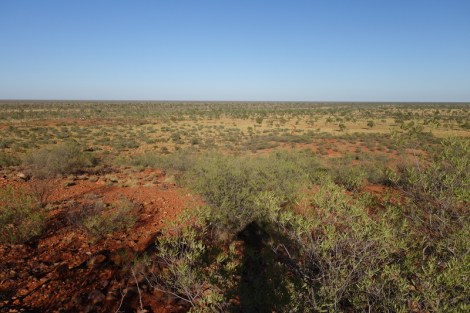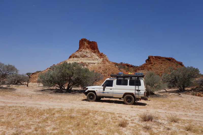 The storms and dust haze had all blown away by morning so we were able to walk up Batten Hill and admire the view. It was only a kilometre away, but my car and the camp were difficult to make out with everything tucked away in the vegetation. Every direction looked the same, with only a little more greenery along the river course and a range of low blue hills off to the north. We walked back to camp, with Clare exhausted by then in the heat of the day, so she was happy to be in the car with the aircon running for a trip out to Goyders Pillar. We basically took any track heading east, as the many tracks bore little resemblance to the Hema map version. Even the Pillar itself once we reached it, was quite obvious, but several kms away from where the map had it placed. That had me a little concerned about the accuracy of Hema for the rest of the route we were to follow.