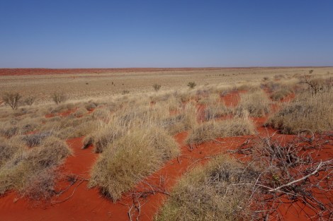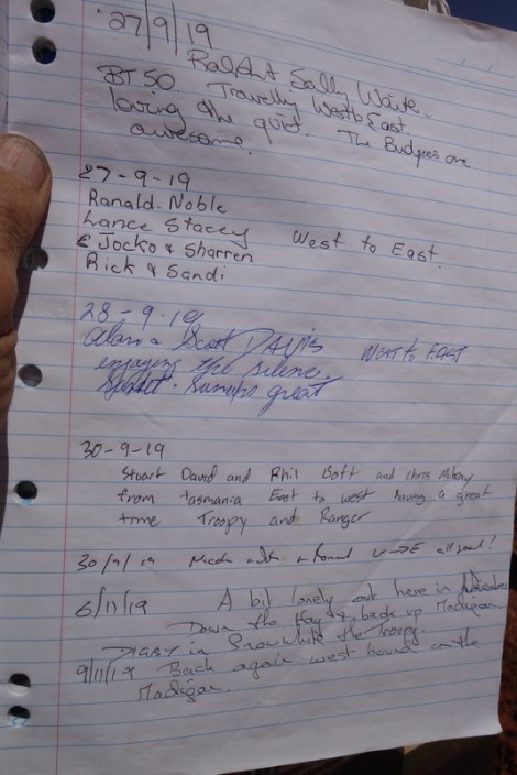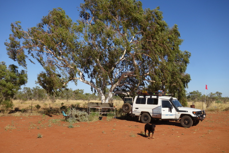 We headed on south down the river bed, although by now the aridity was starting to show, with only the occasional cluster of trees in the swales or low areas between dunes. The track simply followed down the dry mud of the river bed, twisting and turning around holes and reroutes. By the time we reached the Madigan line westerly turnoff, no river could be seen, with the track now simply following the swale, with a red sand dune on both sides. The next 18 km of track was shared with the Madigan, with its easterly leg turnoff marked with a blazed tree and a chained logbook. That part of the Hay River track apparently saw more traffic, with a much smoother surface enabling us to speed up to all of 40 kph for some parts. This was usually regretted with an unseen ridge flicking the troopy rear end violently upwards. All the stuff in the back had to be tied down, or the bumps would cause it all to invade Clare’s space. This included the fridge slide pulling out all the screws. I simply replaced them for the moment but that may become a regular chore. I dutifully signed the Madigan logbook, noting that the last entry was about 6 weeks earlier, in late September.