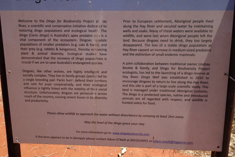 After a second night we made our contribution to the tyre dump, rather than carry the destroyed casing for the rest of the trip. I don’t think anyone will notice mine amongst the hundred or so other dead tyres. Then we headed off south following beside the Hay River, cruising at around 40kph along a hard sandy track for the first 70 km to Dingo Well. Water from the solar bore was running well as part of a Dingo rehabilitation project, not to mention to the delight of the finches again. Clare was also happy for have a paddle and a long drink from the overflow pool. From here the track deteriorated, with lots of washouts and detours, keeping us in 3rd gear at or below 30kph down to the Lake Caroline turnoff.