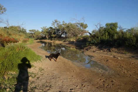 We only needed to drive 80 km of the QAA to Eyre creek and camp, and then decide whether I needed to go another 100 km into Birdsville for fuel before driving back north along the Madigan line. We met our first car since Urandangi about half way along the QAA, a young couple from Melbourne on their grand tour in a 79 series troopy. They had come up to Birdsville through Tibooburra. Clare enjoyed our campsite, going for a paddle every hour or so in the deep green watery mud. Cattle were around but there was not too much dung or smell. Enough for Clare to sniff around delightedly.