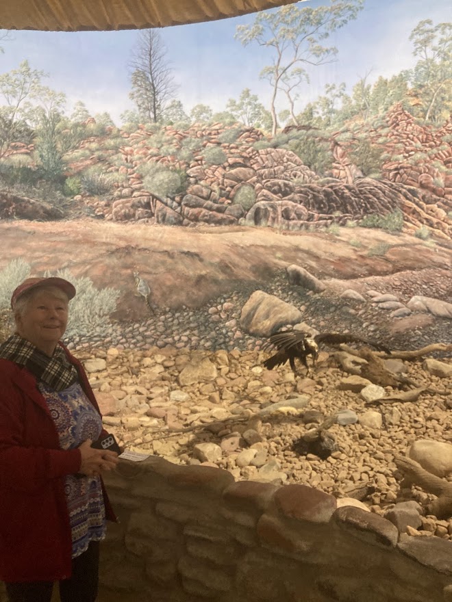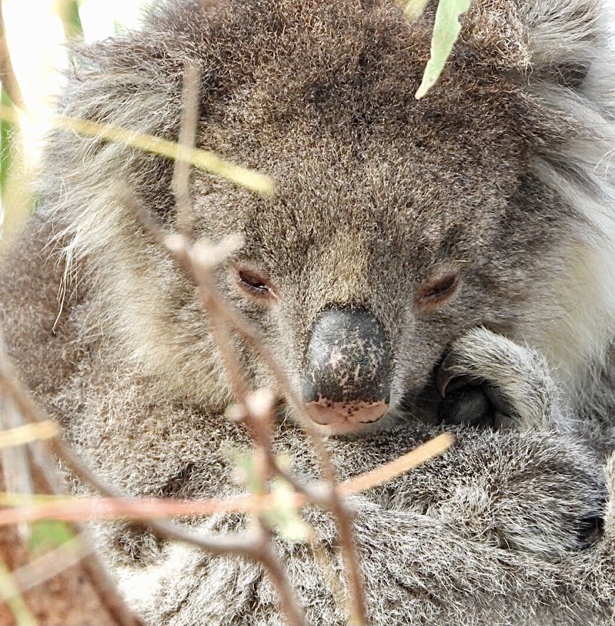 Then on south to Mikkirra, a koala wildlife sanctuary on an old sheep farm. We booked and paid through Hipcamp and the owner, Helen, texted us with the code for the gate key, as well as the code for the Whalers way gate, a closed road nearby apparently owned by her uncle. We spent Tuesday walking several trails around the site, spotting many koalas asleep in stunted manna gums. Sharon managed over 6km so is very happy with that. Much of the property was burned in a severe bushfire 10 years ago and is in recovery. A limestone layer is also on the surface, preventing water penetration but water is accessible below that layer. Not much growing after many years of low rainfall, especially the last few months. 5 koalas were introduced there in 1970, there are now over 50, and we saw about 20 of them sound asleep.