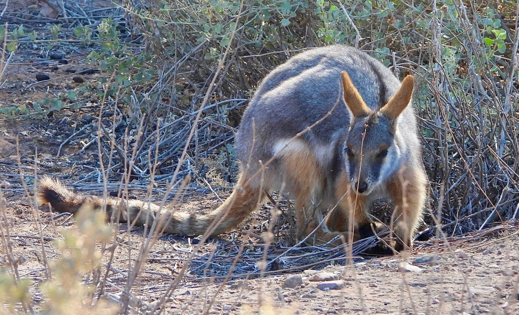 On Sunday we unhitched and drove through the gorge to the western plains. Stopped at a few of the interesting geological sites but they are still just rocks. The detail is often microscopic, but the obvious layering of hard and soft is apparent. A reef of worm castings (archaeocyathea?) was identified by signs, but it still looked like rocks. The tunnels were not as obvious as suggested. We spent half an hour or so at the yellow footed rock wallaby site, scouring the hillsides and scree slopes for them with nothing visible. Then on the way back Sharon spotted one about 5m from the road. I stopped and backed up and managed a few pix, then driving on, I saw another one happily grazing still near the road. Several good pix. Ali’s Memorial Day.