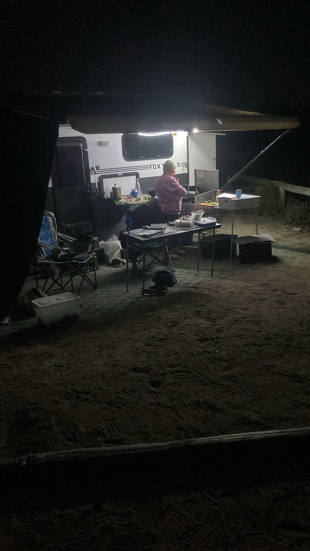 We decided we’d had enough by Wednesday. If it had been calm and not dusty I think we could have stayed on but it was just not pleasant. Chops on the grill on Tuesday night despite the wind. Seemed to be under control ok.
