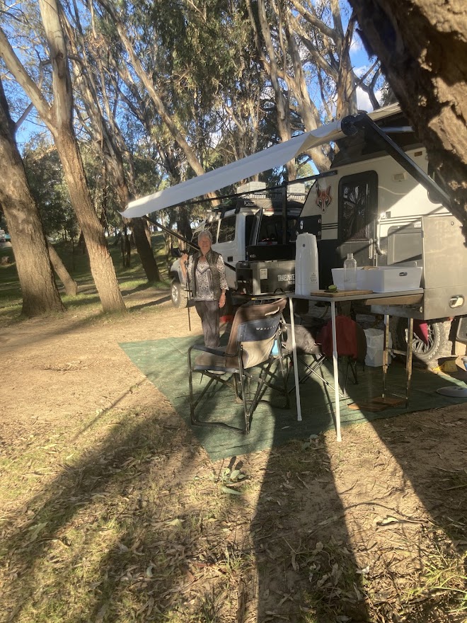 Three hours to Police Paddock campground just out of Corowa, with caravans passing us constantly heading in for the Man from Snowy River weekend. A good time for us to get out of town. About a dozen caravans were set up along the river, some back a way and some on the bank. Recent floods meant that the permanents had moved up a bit, and that they are in the sun. Our batteries are running low, so we’ll need a car charging system on top of the solar.
