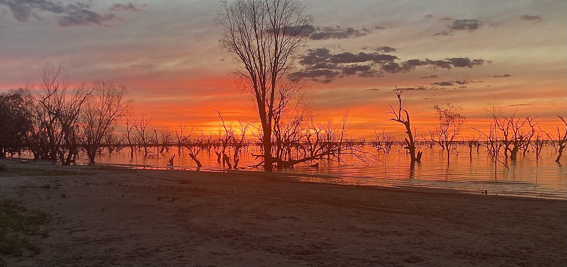 We had a shady campsite but that meant the battery ran flat with no solar input, so we had to run the generator and shut down as much as we could. Another lesson to park in full sun if we want to run the fridge etc. We were packed and rolling by 9:30 on Wednesday, 24th and into Menindee to run through Kinchega and the other lakes across to the silver city Hwy. then south and west into SA and Chowilla game reserve with many camps along a creek. Good internet, so we were able to drive into campsite 20 and book it online for a stay. About 40 km from Renmark.