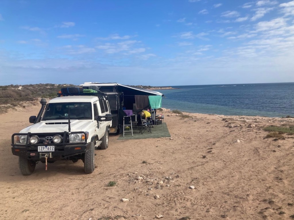 Started south down the east coast as far as Lowly Point and Port Bonython and a camp as close to the beach as we’ve ever been. About 10m of rocky shore, doubling at low tide, somewhat sheltered by a hillside and very pleasant sitting in the shade with a light breeze. Sausages on the brazier for dinner. We decided to stay a second night as it is very peaceful watching the water, although the birding is very scarce. The wrens were quite inquisitive but the male never appeared.
