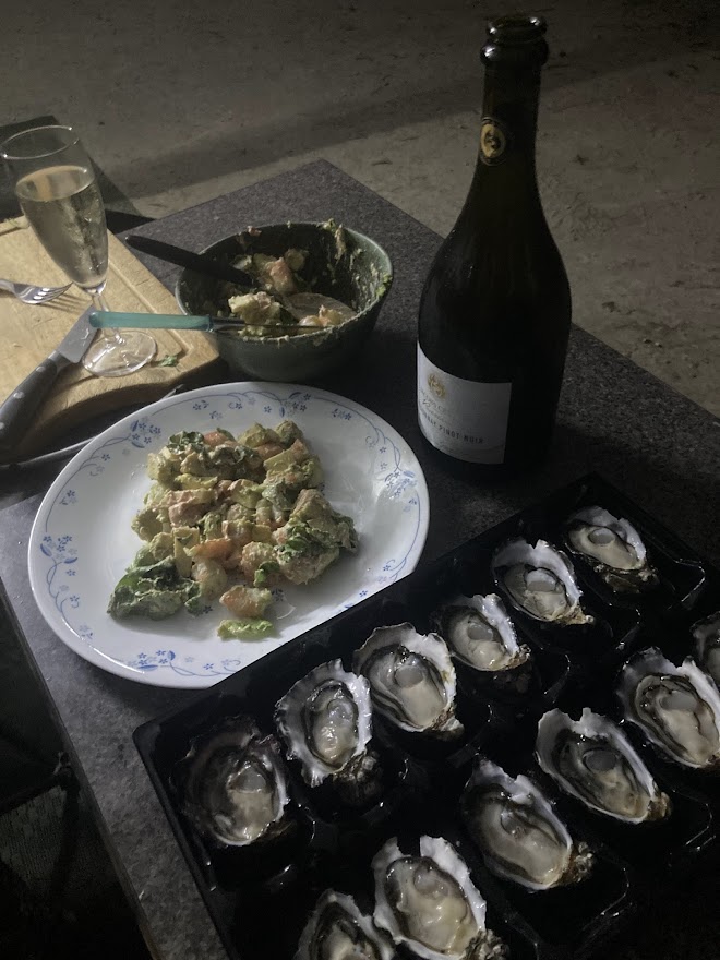 Fresh oysters and prawn avocado salad for dinner with a bottle of sparkling wine. Forgot to collect firewood but the fireplace is a shared one and several metres away from where we’d like it, so we were tucked up in bed by 7.
