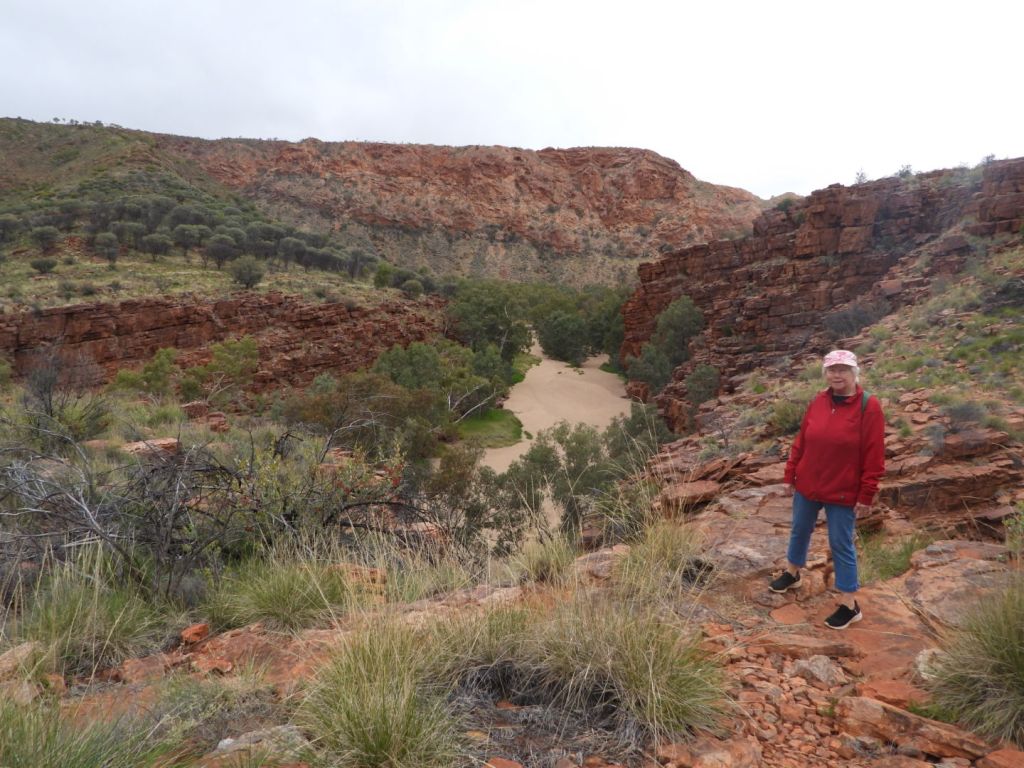 Repaired the broken water pipe. Just a pinhole under the van that I cut out and fitted a joiner. Still no internet with Starlink. Light showers of rain overnight with a cool and overcast day. We managed to fit in a couple of walks between showers. One alongside Trephina gorge and back along the creek, which Sharon recognised from her trip in 2006. We drove out to Ross River resort and the walk up N’Dhala gorge with its petroglyphs. The rock clippings were not well identified, with several we spotted away from the track more impressive than the labelled ones. But still not terribly impressive on an overcast day. Rock cliffs were stunning.