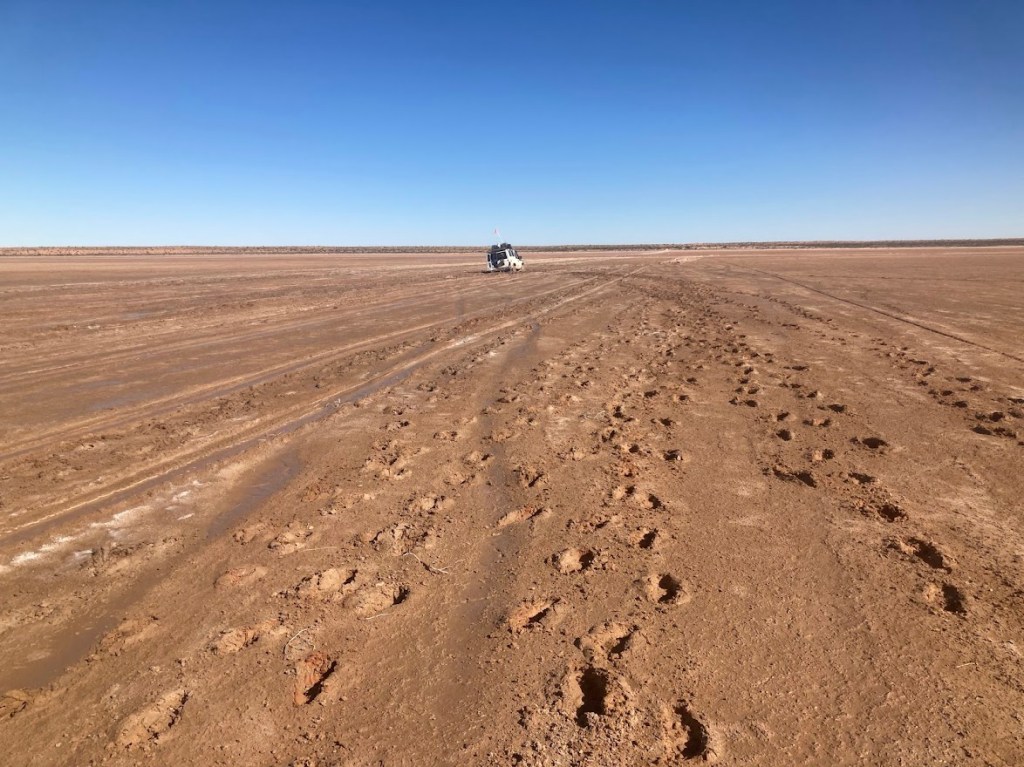 On up the road on Saturday, blowing out a tyre destroying it as well. Oodnadatta for some supplies and fuel starting to get expensive. The campground was quite expensive and the free camp on the edge had no appeal, so we committed to another 3 hours up to Eringa waterhole. A beautiful spot with lots of birds and some very curious pelicans coming down to inspect us. Road had several boggy bits and one very large bull dust hole. Had to engage 4WD several times to be safe and use detours off into the scrub when possible. 370 km for the day makes it one of our longest, but again the flies are so irritating, it’s easier and more comfortable to keep going.